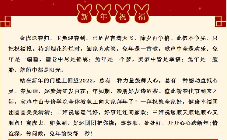 全國(guó)優(yōu)秀校外學(xué)習(xí)中心:寶雞中山專修學(xué)院2023兔年春節(jié)賀詞